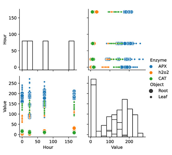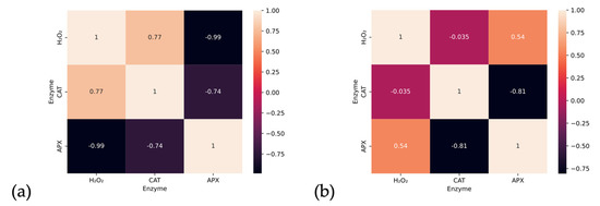 The correlation analysis was visualized in Figure 6. In particular, a very strong negative correlation was observed in the leaf between H2O2 and APX, as well as between CAT and APX. A strong correlation was also noted between CAT and H2O2. In the case of the root, a moderate correlation was observed between the concentration of H2O2 and APX, and a strongly negative one between CAT and APX. Both organs showed a different level of interaction between the enzymes. The diverse interaction between APX and H2O2 is particularly noteworthy. Considering this, as well as the negative correlation between CAT and H2O2 in the root, it can be inferred that in the roots, CAT is mainly responsible for reducing the level of H2O2.