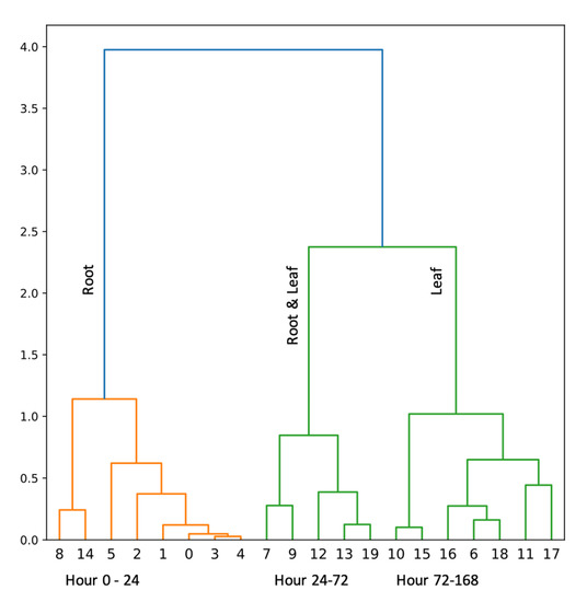The analysis of clusters allowed for the identification of 3 significant groups—characterized by similar variations in the concentration of the studied enzymes. So, the first cluster shows aggregation mainly in the root between 0–24 h. The second cluster shows a similar variability between 24–72 h in both the leaf and the root of M. truncatula. The last cluster allowed for the identification of changes taking place in the leaf between 72–168 h (Figure 5).