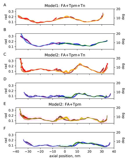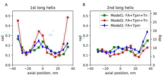 The azimuthal fluctuations of the central part of the Tpm strand for Model 1 (Figure 3) were within the range estimated from the analysis and modeling of X-ray diffraction data [55]. Such fluctuations were small enough to keep the blocked state of the thin filament in the absence of Ca.