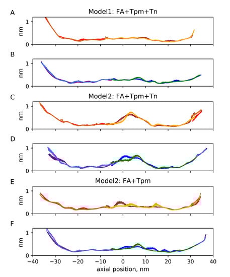 Time-averaged radial fluctuations of Tpm strands 1 (red/light brown and brown/orange; (A, C, and E) panels) and 2 (purple/light blue and blue/green; (B, D, and F) panels). The same color code as in Figure 3.