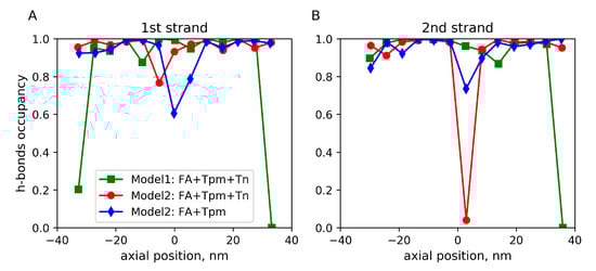 To find out how the actin–Tpm interaction was affected by these fluctuations, we estimated the relative lifetime of hydrogen bonds (h-bonds) between the Lys326 and Lys328 residues of actin and Tpm residues. In each time frame, the h-bond occupancy was set to 1 if at least one h-bond existed; otherwise, it was 0. Values averaged over time are shown in Figure 5. The h-bonding and electrostatic interaction are believed to be involved in the stabilization of the blocked state of the thin filament [53].