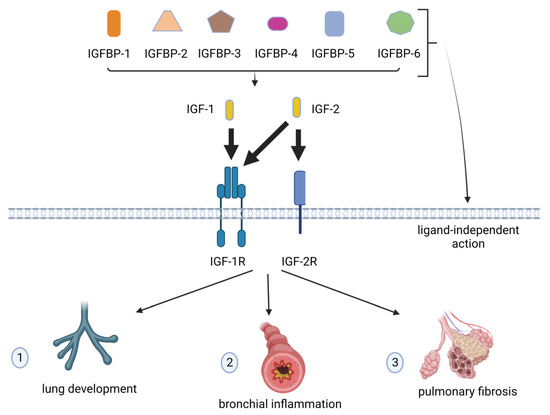 Several pieces of evidence indicate the role of the IGF and IGFBP signaling pathways in lung development and diseases, including inflammation, congenital disorders, tumor, and fibrosis. The IGF network also controls the maturation and differentiation of several types of lung cells, counting airway basal cells, alveolar epithelial cells, and fibroblasts [40].