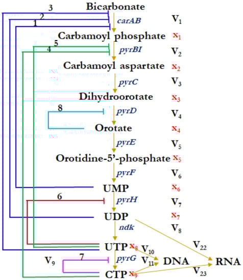 - Rodríguez, M.; Good, T.A.; Wales, M.E.; Hua, J.P.; Wild, J.R. Modeling allosteric regulation of de novo pyrimidine biosynthesis in Escherichia coli. J. Theor. Biol. 2005, 234, 299–310. [Google Scholar] [CrossRef]
