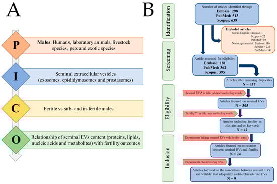 The criteria for screening, eligibility, and inclusion applied in this systematic review are depicted in the flowchart of Figure 1B. These procedural steps in the review research were carried out by the signatory reviewers A.P. and J.R., and any inconsistencies or discrepancies that arose were resolved through debates with two other signatory reviewers, I.B. and L.P. The set of references identified from the searches in the three databases was screened to select only articles written in English and reporting experimental studies. Accordingly, reviews, books and books chapters, abstracts of conference presentations, letters, commentary articles, replies, errata, and editorials were all excluded. The selected records from each database were collected in a single database, and duplicates were removed. Then, the selected articles were examined to choose those that focused on sEVs. The first eligibility criterion was that the articles should include sEV or related words such as epididymosome, prostasome, exosome in the title, abstract, and/or keywords. Next, the selected articles were subjected to a second eligibility criterion to choose those that related sEVs with fertility issues. For this, the eligibility criterion was that articles had to include the word fertility or a related word such as infertility, subfertility, fertilization, and recurrent pregnancy loss (RPL) in the title, objective/s, and/or keywords. Finally, to define which articles would be included and which would be excluded, the full text of the eligible articles was reviewed. Only articles that (a) performed experiments aimed at associating EVs with fertility problems and (b) properly isolated and characterized EVs using ISEV-recommended methods [] were included. Proper isolation and characterization of EVs are critical methodological steps that provide robustness in evaluating the results obtained in EV research studies.