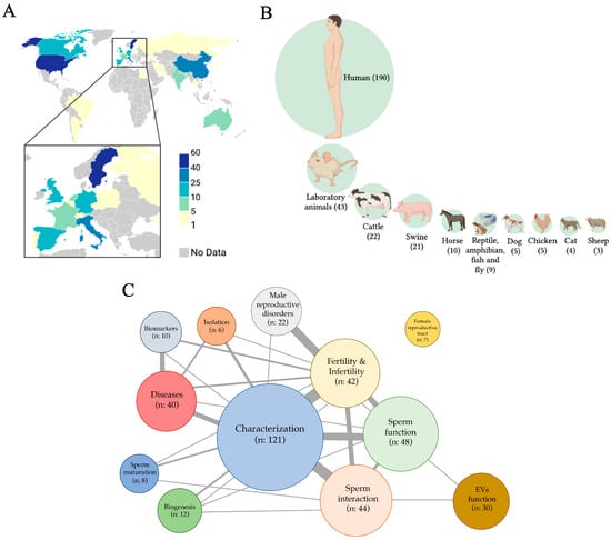 The screening and eligibility processes led to the inclusion of a total of 305 references focused on sEVs (Supplementary File S2). The first article was published in 1982, and since then, the number of articles published has exponentially grown. In total, 12 articles were published in the 1980s, 46 in the 1990s, 63 in the 2000s, 109 in the 2010s, and 75 from 1 January 2020 to 31 December 2022. The articles have been published in 130 scientific journals, highlighting Andrology (including the former Journal of Andrology and International Journal of Andrology) with 24 published articles, The Prostate with 19 articles, and Biology of Reproduction with 18 articles. The research was conducted in laboratories of 28 countries, with Sweden (61 articles), the United States (51 articles), China (39 articles), Italy (31 articles), Canada (24 articles), Spain (14 articles), Germany (10 articles), and the United Kingdom (10 articles) standing out (Figure 2A). The most active research centers have been Uppsala University Hospital, Sweden, with 55 published articles; the Faculté de Medicine de la Université Laval, Québec, Canada, with 23 articles; and the Istituto di Biochimica e Chimica Medica, Università di Perugia, Italy, with 18 articles. The research published in the 305 eligible articles was mainly conducted in humans (190/305, 62.3%), distantly followed by laboratory animals (rodents, 43/305, 14.1%), cattle (22/305, 7.2%), and swine (21/305, 6.9%). Seminal EVs from other species, either mammalian (horse, dog, chicken, cat, and sheep) or non-mammalian (reptile, amphibian, fish, and fly), were also investigated, although to a lesser extent (Figure 2B). The main topics addressed in the eligible articles were the characterization of sEVs (121/305, 39.7%), distantly followed by those addressing the relationship of sEVs to sperm function (48/305, 15.7%), the interaction of sEVs with sperm (44/305, 14.4%), those relating sEVs to fertility/infertility (42/305, 13.8%), and those relating sEVs to diseases (40/305, 13.1%), mainly prostate cancer and those caused by sexually transmitted viruses. Other research topics were also addressed, but to a lesser extent, including the functional performance of EVs, their biogenesis, isolation, usefulness as biomarkers, their involvement in male reproductive disorders and sperm maturation, and their functional role in the female reproductive tract (Figure 2C). Many of the articles addressed two or more research topics, most notably relating to EV characterization and fertility, EV characterization and sperm interaction, EV characterization and sperm function, and male reproductive disorders and fertility.