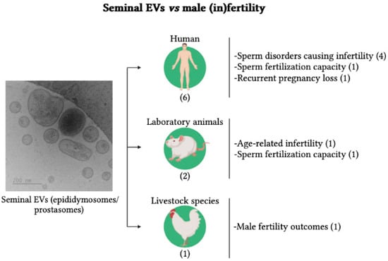More studies in laboratory and livestock species would be desirable. These species allow trials with many individuals or samples, not only from semen donors but also from healthy breeding females, since semen from a single male is often used by AI to inseminate many females with a single ejaculate. Furthermore, in these species, in addition to fertile and infertile males, there are also subfertile males, a reproductive status that may facilitate a better understanding of the relationship of seminal EVs to fertility outcomes.