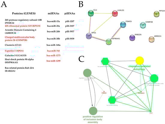 The sEV proteins highlighted in the included studies were analyzed using STRING and Cytoscape to determine possible relationships among them and to discover related functional pathways. STRING generated a single protein–protein interaction network including five genes (Figure 4B). The resulting protein–protein interaction network was analyzed with the ClueGo plugin of the Cytoscape software, revealing that the encoded proteins appear involved in two pathways, namely: chaperone-mediated autophagy and positive regulation of inclusion body assembly (Figure 4C).