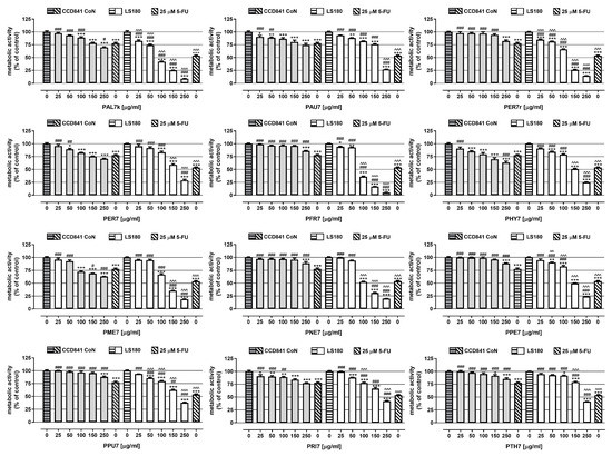 Used as a positive control for the experiment, 5-fluorouracil (5-FU) at a concentration of 25 µM decreased the metabolic activity of CCD841 CoN and LS180 by 22.2% and 46.2%, respectively. All the investigated extracts at the highest tested concentrations revealed a stronger anticancer effect than 5-FU. Seven of twelve extracts inhibited LS180 cells’ viability better than 5-FU, when used at lower concentrations; the beneficial effect of PER7r, PHY7, PME7, and PPE7 was observed at concentrations of 150 and 250 µg/mL, while the beneficial effect of PAL7r, PFR7, and PNE7 was observed at concentrations from 100 to 250 µg/mL. In the case of CCD841 CoN cells, only 3 out of 12 of the investigated extracts inhibited the metabolic activity of colon epithelial cells stronger than 25 µM 5-FU: PAL7r (250 µg/mL); PHY7 (250 µg/mL); PME7 (150 and 250 µg/mL).