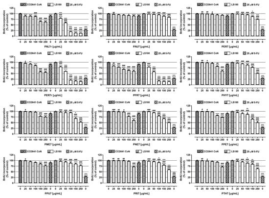 Examination of the anticancer potential of extracts was conducted simultaneously on both cancer (LS180) and normal (CCD841 CoN) colon cells. Cells at a density of 5 × 104 cells/mL were plated on 96-well plates. The next day, the cell growth medium was exchanged for fresh medium supplemented with investigated extracts or 25 μM 5-fluorouracil (5-FU). After 48 h of treatment, compound impacts on cell membrane integrity, metabolic activity, and DNA syntexis were examined using LDH, MTT, and BrdU assays, respectively. The description of the execution of indicated tests was previously presented [10].