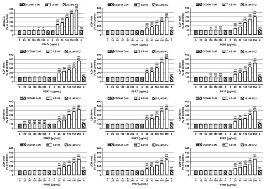 The influence of extracts on cell membrane integrity of CCD841 CoN and LS180 cell lines. The cells were exposed for 48 h to the culture medium alone (control). extract at concentrations of 25–250 µg/mL. or 25 μM 5-fluorouracil (5-FU; positive control). Extracts’ cytotoxicity (level of LDH released into the cell culture medium from damaged cell membranes) was measured using an LDH assay. Results are presented as mean ± SEM of at least 3 measurements. * p < 0.05; ** p < 0.01; *** p < 0.001 vs. control. # p < 0.05; ## p < 0.01; ### p < 0.001 vs. positive control. ^^^ p < 0.001 colon cancer cells treated with extract/5-FU vs. colon epithelial cells exposed to the extract/5-FU at the corresponded concentration; one-way ANOVA test; post-test: Tukey’s.