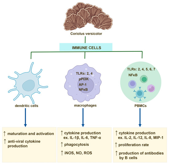 Studies have shown that macrophages are one of the main target cells of CV extract. In vitro experiments demonstrated the direct effect of β-glucans and PSP derived from CV on the activation of macrophages, which is manifested by the increased expression of inducible nitric oxide synthase (iNOS) and production of reactive nitrogen intermediates and reactive oxygen intermediates [48,56].
