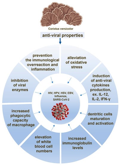 Among the bioactive properties of compounds derived from CV, their anti-viral activity against numerous viruses is well described. The high therapeutic index of CV extract was discovered against herpes simplex virus (HSV) type 1 and HSV type 2 in the experiments conducted on the kidney epithelial cells in vitro (EC50 = 77 µg/mL measured for the both HSV types) [75]. Liu et al. revealed that PSK can inhibit Epstein–Barr virus (EBV)-infected B and T cells and activate natural killer (NK) cells [76]. It has also been reported that PSP has an inhibitory effect against human immunodeficiency virus (HIV) type l reverse transcriptase and protease that are two enzymes of paramount importance to the life cycle of HIV (IC50 = 150 μg/mL and IC50 = 6.25 μg/mL measured for the interaction between HIV-1 gp120 and immobilized CD4 receptor and for the potent inhibition of recombinant HIV-1 reverse transcriptase, respectively) [77]. Rodriguez-Valentín et al. observed that PSP exerts an anti-HIV activity mediated by TLR4 and promotes the upregulation of specific anti-viral chemokines (RANTES, MIP-1) and stromal cell-derived factor 1 (SDF-1α)) known to block HIV-1 co-receptors [78]. Furthermore, oral administration of β-glucans from CV improves survival and reduces lung viral titers and weight loss in chickens and mice infected with the influenza virus [21]. CV-based vaginal gel is also available for treating women with cervical uterine high-risk human papillomavirus (HPV) infection [79,80].