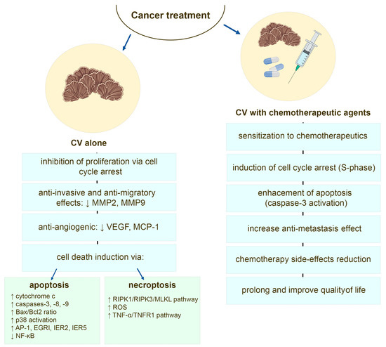 There are plenty in vitro and in vivo studies demonstrating that CV compounds, among them PSP and PSK, besides cancer cells sensitization to various chemotherapeutic agents, can also induce tumoricidal effects [65,91,98,115,120,121,122,123,124,125,126,127,128,129,130,131,132,133,134] and have inhibitory effect on tumor growth and metastasis in animal models [66,98,120,135,136]. These effects are associated with reduced proliferation mainly via cell cycle arrest [120,123,124,131,137,138] and induction of different mode of cancer cells death, such as apoptosis, necrosis, or necroptosis [120,121,122,124,125,127,128,133,134,136].