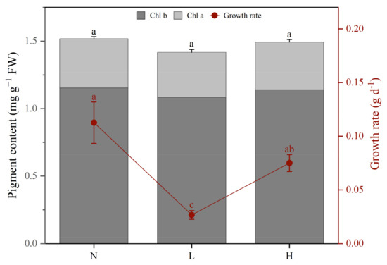 The growth rate and chlorophyll a and b pigment content of Myriophyllum aquaticum under different phosphorus concentrations. N, normal phosphorus concentration treatment (0.25 mM); L, low phosphorus concentration treatment (0.02 mM); H, high phosphorus concentration treatment (5 mM). Different lowercase letters above the error bars in the same color mean significant differences, and bars sharing the same letter are not significantly (Turkey’s test).