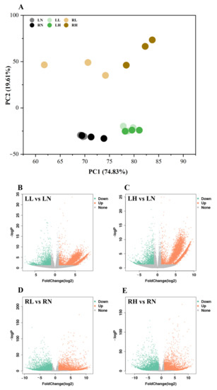 Principal component analysis (PCA) of the gene expression at different concentrations of phosphorus (A), and volcano plots of the differentially expressed genes (DEGs) between control and treated Myriophyllum aquaticum (B–E). LN, LL and LH: leaf samples from normal (0.25 mM), low (0.02 mM) and high (5 mM) phosphorus concentration treatment; RN, RL and RH: root samples from normal (0.25 mM), low (0.02 mM) and high (5 mM) phosphorus concentration treatments.