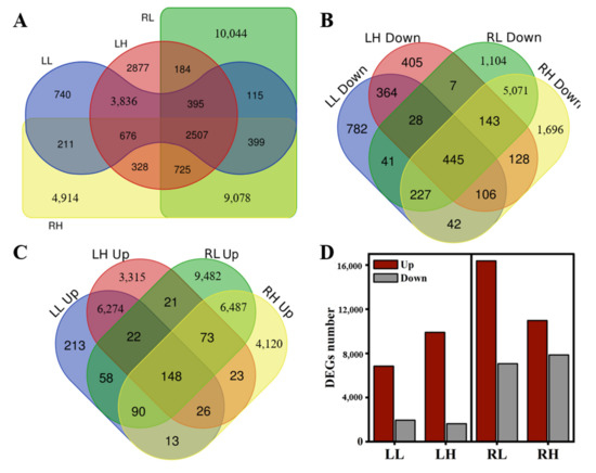 Differentially expressed genes (DEGs) among different groups in Myriophyllum aquaticum. Venn diagram of all DEGs, down-regulated and up-regulated genes, respectively (A–C); Total number of up-regulated and down-regulated DEGs (D). LL and RL, leaf and root from low phosphorus concentration treatment; LH and RH, leaf and root from high phosphorus concentration treatment.