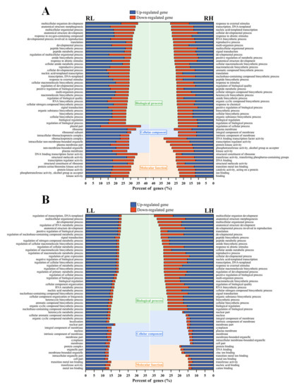 Significantly enriched Gene Ontology (GO) terms (top 50) for differentially expressed genes (DEGs) in roots (A) and leaves (B) of Myriophyllum aquaticum. LL and RL, leaf and root from low phosphorus concentration treatment; LH and RH, leaf and root from high phosphorus concentration treatment.