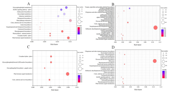 Significantly regulated Kyoto Encyclopedia of Genes and Genomes (KEGG) pathways among different groups in Myriophyllum aquaticum, leaf and root from low phosphorus concentration treatment (A,B); leaf and root from high phosphorus concentration treatment (C,D).