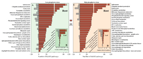 Statistics analysis of Kyoto Encyclopedia of Genes and Genomes (KEGG) enrichment among different groups in Myriophyllum aquaticum), leaf and root from low phosphorus concentration treatment (A,B); leaf and root from high phosphorus concentration treatment (C,D).