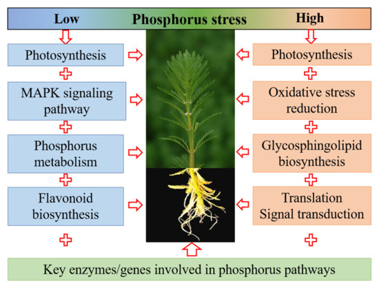 Enzymes are biocatalysts that control many processes of metabolism, nutrition, and energy conversion. During plant growth and development, many enzymes are activated to resist or adapt to adverse stresses [51,52,53]. The results of KEGG annotation of the expression of genes encoding superoxide dismutase and other antioxidant enzymes showed a larger decline under low phosphorus than high phosphorus stress (Figure 5 and Figure 6), which may lead to more reactive oxygen species accumulation under low phosphorus conditions such as H2O2 and malondialdehyde [17,21,36]. On the other hand, plant cells interpret phosphorus as a signaling chemical, and high phosphorus concentrations result in lower expression levels of genes involved in phosphorus absorption [54,55]. Under low phosphorus stress, however, key genes engaged in phosphorus metabolism were up-regulated, indicating that these genes contributed to phosphorus absorption (Figure 6) [56,57]. The energy metabolism, and transport–catabolism pathways were highly enriched in the low phosphorus stress group, but their enrichment was significantly reduced in the high phosphorus stress group, indicating that M. aquaticum’s energy metabolism, and transport–catabolism pathways were severely inhibited under low phosphorus stress (Figure 6) [44,58,59]. The pathways responsible for phosphorus uptake, translocation, assimilation, utilization, and remobilization were also studied (Table S4). For example, phosphorus transporter gene expression increased in M. aquaticum under low phosphorus concentration, showing that these genes contributed to phosphorus absorption under low phosphorus stress. The differences in the enrichment pathways under low phosphorus and high phosphorus stress showed that the complex and diverse metabolic pathways were regulated by M. aquaticum in response to different levels of phosphorus stress, enabling it to respond effectively to different levels of phosphorus stress. A graphic model was built to summarize and better understand the probable biological mechanisms of M. aquaticum for tolerance to different levels of phosphorus stresses (Figure 7). Under low phosphorus stresses, the genes related to photosynthesis pathways, MAPK signaling pathways, and phosphorus metabolism pathways in leaves, and flavonoid biosynthesis pathway in roots were mainly regulated. Under high phosphorus stresses, the genes related to pathways of photosynthesis, oxidative stress reduction, and glycosphingolipid biosynthesis in leaves, and pathways of translation and signal transduction in roots were mainly regulated. Commonly, key enzymes and genes involved in phosphorus pathways were also functioned to cope with low and high phosphorus stresses. However, the above conclusions drawn merely from statistically significant differential expression of assembled transcripts are relatively preliminary, and should be confirmed by more quantitative methods such as qPCR assay to obtain a more definite conclusion.