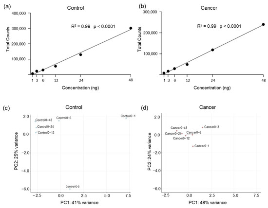 Titration experiment using total RNA derived from blood platelets of cancer patient and asymptomatic individual. (a) Six different inputs (1 ng, 3 ng, 6 ng, 12 ng, 24 ng and 48 ng) of total RNA derived from platelets of a non-cancer individual (Control) were tested using human immunology v2 panel with nCounter platform. Total number of counts detected (after negative background removal) follow a linear regression model (R2 = 0.99, p-value < 0.0001). (b) A similar experiment was performed using total RNA derived from lung cancer platelet sample, and in this case, the total number of counts after background removal follow a linear regression model (R2 = 0.99, p-value < 0.0001). (c) Principal Component Analysis (PCA) assessing RNA profile of Control sample using six different initial inputs of total RNA. (d) PCA assessing RNA profile of Cancer sample using six different initial inputs of total RNA.