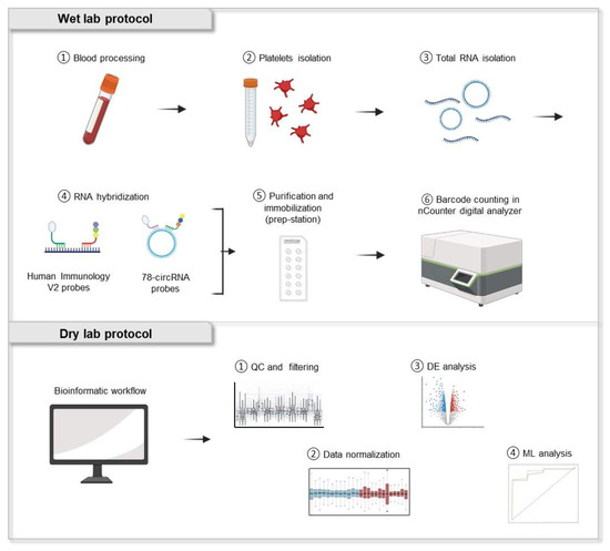 Wet and dry lab workflow for the study of mRNA and circRNA derived from blood platelets using nCounter technology. Total RNA is extracted from human platelets and directly hybridized with nCounter probes. Hybridization and purification are performed on the nCounter prep-station and counting of the hybridized barcode is performed on the nCounter digital analyzer. Bioinformatic workflow consists of quality control (QC) and data filtering, normalization of counts, differential expression (DE) analysis, and the generation of a prediction model through the use of ML algorithms.