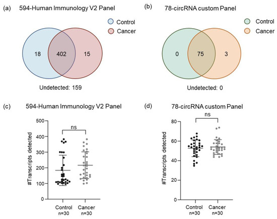 The analysis of the average number of transcripts detected per group using the human immunology v2 panel revealed 185 ± 97 mRNAs in the control group and 218 ± 85 mRNAs in the cancer group (Figure 3c). Although the average number of transcripts is slightly higher in the cancer group than in the control, the difference is not statistically significant (ns) (Mann–Whitney’s U p-value > 0.05) (Figure 3c).