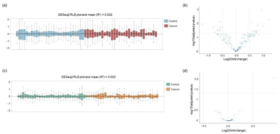 Prior to normalization, negative control probes embedded to each panel were used to filter out targets with poor expression and high background noise. Consequently, the background values were firstly calculated, by taking the mean of each sample’s negative controls increased by two times the standard deviation, and then removed from each sample. Any transcript that indicated a score of less or equal to 0 in more than 75% of the examined samples was excluded from further examination. After these filtering steps, the data was again evaluated using a PCA plot. Two different packages were compared for the normalization of the data: DESeq2 (version 1.30.1) and edgeR (version 3.32.1). The normalization performance was assessed using the standard relative log expression (RLE) plot. DESeq2 was chosen as the default to perform the normalization of the data. Differential expression (DE) analysis was performed to find significantly differentially (|FC| > 0.5 and p-adj < 0.05) expressed genes between the cancer and control groups.