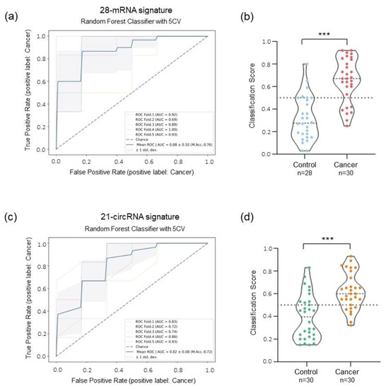 ML analysis using single signature of mRNA and circRNA. (a) AUC ROC curve of the 28-mRNA signature using RF classifier for group classification. (b) Violin plot of the classification score of samples generated using the 28-mRNA predictive model (*** indicates p-value < 0.001 in a two-tailed Mann–Whitney U test). (c) AUC ROC curve of the 21-circRNA signature using RF classifier for group classification. (d) Violin plot of the classification score of samples generated using the 21-circRNA predictive model (*** indicates p-value < 0.001 in a two-tailed Mann–Whitney U test).
