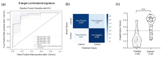 ML analysis using combinatorial signature of mRNA and circRNA. (a) AUC ROC curve of the 8-mRNA-circRNA signature using RF classifier for group classification. (b) Confusion matrix indicating the number of the correctly classified and misclassified samples based on the previous prediction model. (c) Violin plot of the classification score per samples generated using the 8-mRNA-circRNA predictive model (*** indicates p-value < 0.001 in a two-tailored Mann–Whitney U test).