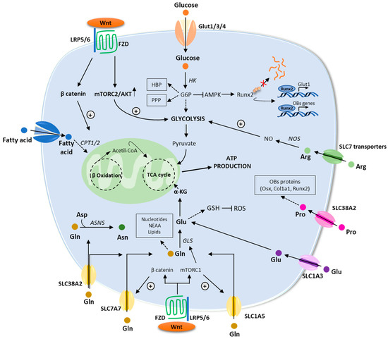 Recent studies have revealed that the WNT pathway directly reprograms cellular metabolism by stimulating aerobic glycolysis, fatty acid oxidation, and Gln catabolism in OB lineage cells [55]. WNT-mammalian target of rapamycin complex-1 (mTOR) signaling increases protein levels of key enzymes implicated in glucose and Gln metabolism [55]. Furthermore, mRNA levels for genes implicated in fatty acid oxidation increased in response to β-catenin activation [52]. In the next paragraphs, we will provide an overview of the main metabolic pathways regulating OB functions (Figure 3).