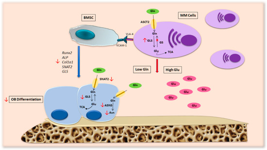 Our group found that Gln depletion imposed by MM cells in patients’ BM compromises OB differentiation [7] (Figure 4). Analyzing the transport of Gln in MM cells and stromal cells, we saw that MM cells internalize a greater amount of Gln than stromal cells, resulting in a decrease in amino acids in the culture medium. Moreover, the differentiation potential of stromal cells decreases when they are cultured in a medium conditioned by MM and is restored by the addition of Gln. These observations suggest that MM cells generate a microenvironment characterized by low Gln levels that can affect the differentiation and activity of OBs. In fact, differentiated MSCs in the presence of a concentration of Gln mimicking the medullary plasma of patients with MM show a significant decrease in osteoblastic markers [7].