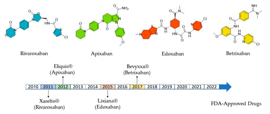 Cardiovascular diseases are the leading cause of death worldwide, with 17.9 million reported cases in 2019 alone [1]. Currently, direct FXa inhibitors are among the most widely applied oral anticoagulants for the effective treatment of thromboembolic disorders [2,3]. In this context, Eliquis® (apixaban) and Xarelto® (rivaroxaban), are among the 10 best-selling drugs in the world, with accumulated joint sales of approximately USD 16.1 billion in 2020 alone [4]. These new FXa inhibitors, introduced after 2011 (Figure 1), are effective for the prophylaxis of deep vein thrombosis, strokes, and pulmonary embolism [5,6]. They show various advantages compared with long-established alternatives such as vitamin K antagonists. These advantages include more favorable bleeding profiles, fewer contraindicative drug interactions, a wider therapeutic range, and easier application routes [7,8,9].