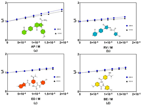 Stern–Volmer quenching plots for HSA with: (a) apixaban, (b) rivaroxaban, (c) edoxaban, and (d) betrixaban, at 298 K and 310 K.