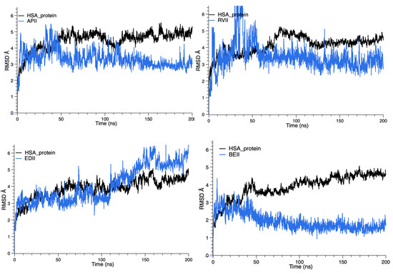 RMSD evolution for four HSA-FXa inhibitor complexes.
