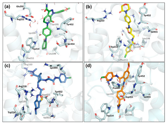 Representative binding mode of the FXa inhibitors at the HSA binding site 1: (a) apixaban in green, (b) rivaroxaban in yellow, (c) edoxaban in blue, and (d) betrixaban in orange.