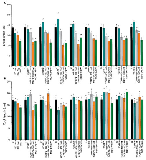 Effects of salt stress (150 mM, 300 mM, and seawater 100%) and microbial inoculation on wheat: (A) shoot length; and (B) root length. Data points are the mean of three technical replications, and error bars represent standard error. Bars with different letters are significantly different from each other, as evaluated by DMRT analysis.