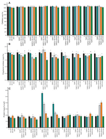 Different enzymatic and non-enzymatic antioxidant activities were determined in wheat plants under NaCl stress and in fungal-inoculated plants. Catalase levels decreased in salt-treated plants as compared to control plants. However, some fungal strains such as GREF1, TQRF7, and MGRF1 showed an increase in CAT levels (Figure 4A). Most of the fungal strains showed a rise with 150 mM and 300 mM salt stress. Similar results were observed in polyphenol oxidase (PPO), and the GREF1 strain showed an upsurge in 150 mM salt stress compared to its respective control (Figure 4B). In total protein contents (TP), a reduction was observed in 150 mM and SW, while an increase was found in 300 mM salt stress (Figure 4C). The fungal strains showed different effects, and some strains, such as GREF1, GREF2, and TQRF9, showed significant enhancement in protein contents as compared to their respective control plants. Inoculation of GREF1 and GREF2 significantly (210.1% and 112.8%) improved the protein contents as compared to the control. GREF1 dramatically (111.1%) enhanced the protein content under 150 mM salt concentration while most of the microbes significantly boosted the protein content in 300 mM, but notably, we observed that TQRF9 showed a 123.8% increase as compared to control and inoculated treated plants.