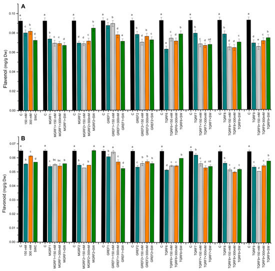 The results revealed that salt stress significantly increased flavonoid contents compared to control plants. In the case of flavonoid contents, the fungal strains did not show any considerable effect except for TQRF9 and GREF1, where a significant increase was observed in flavonoid contents as compared to their respective control plants (Figure 5). Similar results were observed in flavonol contents and salt stress, significantly inhibiting the accumulation of flavonols in wheat plants as compared to the control. Flavonols accumulation was inversely proportional to the salt concentration, and a decrease was observed in 150 mM, 300 mM, and SW, respectively (Figure 5). The fungal inoculation did not show much significant change in flavonol accumulation, except for the GREF1 strain, which showed a significant increase in 150 mM salt stress compared to respective control plants.