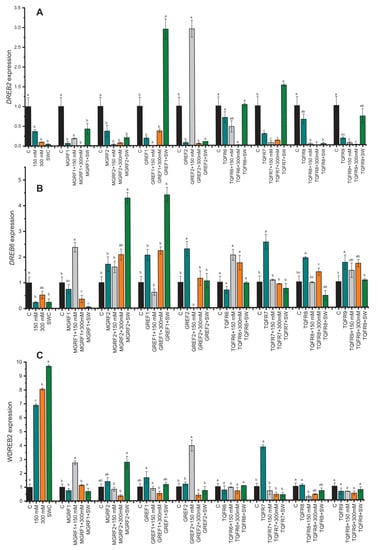 The relative expression of genes associated with abiotic stress and microbial signaling was examined to determine the molecular mechanism behind the reduction in salt stress in wheat plants. In the current study, we evaluated DREB2 (GU785008.1), DREB6 (AY781361.1), and WDREB2 (AB193608.1), by RT–qPCR (Quantitative Reverse Transcription Polymerase Chain Reaction), which are genes reported to be closely associated with osmotic stress. The expression levels of DREB2 and DREB6 were downregulated under salinity stress (Figure 6A). However, the WDREB2 gene was found to be highly upregulated during salt stress conditions which was directly proportional to salt concentration. GREF1 and GREF2 inoculated plants showed increased expression of the DREB2 gene in 100% of plants under 150 mM salinity stress (Figure 6). In the case of fungal-inoculated plants, WDREB2 expression was found to be downregulated during salt stress. On the other hand, DREB6 was suppressed with salt stress, while after fungal application, it was found to be upregulated. The results showed that the expression of DREB6 was significantly higher in endophyte-inoculated plants than in non-inoculated control plants, especially in MGRF2- and GREF1-treated plants.