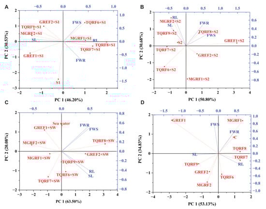 Principle Component Analysis (PCA) Biplots: (A) Control Biplots; (B) 150 mM; (C) 300 mM; and (D) 100% Sea water.