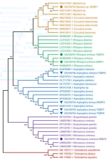 Many microbes found in plant rhizospheres produce secondary metabolites that enhance the tolerance of plants to biotic and abiotic stresses. Fungi release secondary metabolites, particularly GAs, that significantly boost plant development. Several investigations have already revealed GAs synthesized by fungus species and their ability to enhance plant growth [41]. Many fungus species, including Phoma sp., P. funiculosum, and Aspergillus sp., have previously been observed to produce GAs in culture filtrates [41]. Fungi that synthesize GAs in the rhizosphere soil or within host plant roots act as an external source of GAs and IAA, which enhance plant growth. In the past, several fungal endophytes were identified using the 18S internal transcribed spacer (ITS) [36,42]. The fungal strains used in this study were identified based on morphological characteristics, and sequences of ITS regions. The phylogenetic analysis using the neighbor joining (NJ) method identified MGRF1 as Bipolaris sp., MGRF2, TQRF6 and TQRF7 as Aspergillus terreus, GREF1 and TQRF9 as Rhizopus arrhizus, TQRF8 as Aspergillus nidulans and GREF2 as Microascus cinereus using ITS regions.