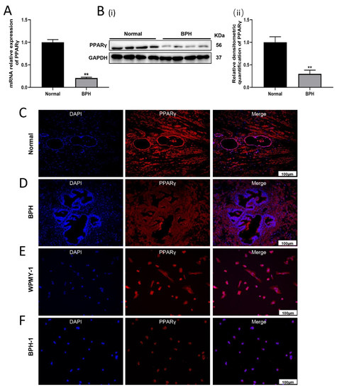 Localization and expression of PPARγ in human prostate tissues and cultured human prostate cell lines. (A) Relative expression of PPARγ mRNA levels in human BPH tissues and normal prostate tissues. (B) Western blot assay (i) and relative densitometric quantification (ii) of PPARγ proteins in human BPH tissues and normal prostate tissues. (C,D) Immunofluorescence localization of PPARγ in human normal and hyperplastic prostate. (E,F) Immunofluorescence staining of PPARγ in human prostate epithelial cells (BPH-1) and stromal cells (WPMY-1). DAPI (blue) indicates nuclear staining and Cy3-immunofluorescence (red) indicates PPARγ protein staining. Sections of all samples were used for immunofluorescence experiments, and representative images were selected. ** p < 0.01. Student’s t test. The scale bars are 100 μm.