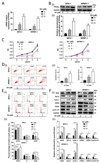 We further translated our in vitro studies into in vivo. Our BPH model induced by testosterone propionate was confirmed by a significant weight increase of the prostate and seminal vesicles when compared with the controls. In addition, SV treatment was validated with significantly lowered serum cholesterol and triglycerides. Similar to our previous observation, a body weight loss was found in BPH rats, which may be due to an increase in daily activities and an increase in lean body mass/fat body mass ratio caused by exogenous testosterone supplementation. Therefore, BPH rats had an even higher relative prostate weight/body weight ratio than that of controls. In addition, consistent with previous studies [85,86], T injection mainly resulted in a significant degeneration of acinar epithelial hyperplasia, such as increased acinar number, protrusion of papillary lobes into the glandular lumen, and thickening of the epithelial layer without a change in the percentage of stromal components. However, the relative prostate weight/body weight ratio of BPH rats was significantly decreased by SV (i.g.) for 28 days. Unlike untreated BPH animals, both epithelial and stromal components of the prostate were reduced in SV-treated BPH rats, which was possibly attributed to SV affecting both the stroma and epithelium. Instead, T mainly showed an influence on the gland. Parallel to our in vitro experiments, GW9662 could significantly reverse the therapeutic effect of SV on the prostate. Moreover, Western blot showed that SV increased the expression of PPARγ, BAX, E-cadherin, and Cyto c and decreased the expression of CDK2, CDK4, cyclin D1, Bcl-2, α-SMA, collagen I, N-cadherin, Vimentin, and Snail. In addition, PPARγ antagonist GW9662 (i.p.) reversed the above changes induced by SV to a certain extent. All these in vivo observations are consistent with our in vitro findings.