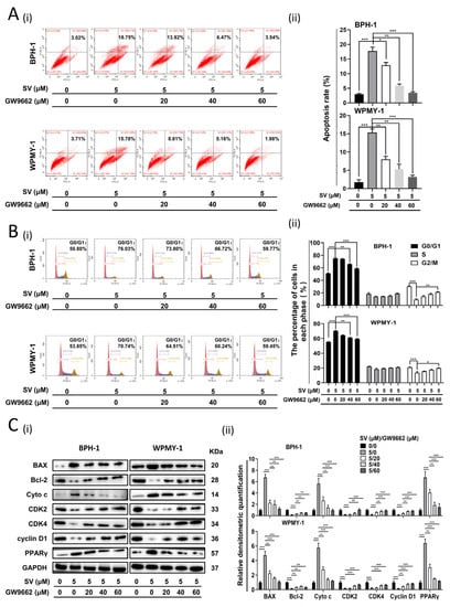 Recovery by GW9662 for cell apoptosis and cell cycle arrest at G0/G1 phase triggered by SV in prostate cells. (A) Apoptotic cells staining with Annexin V and PI were revealed by flow cytometry analysis in BPH-1 and WPMY-1 cells treated by GW9662 at 0 μM, 20 μM, 40 μM, and 60 μM for 24 h, and continually treated by simvastatin at 0 μM and 5 μM for 48 h (i). Apoptotic rates (%) were statistically analyzed (ii). (B) Flow cytometry analysis of the cell cycle in BPH-1 and WPMY-1 cells after simvastatin and GW9662 treatment (i). Cell cycle arrest at G0/G1 phase by GW9662 was statistically analyzed (ii). (C) Western blot assay (i) and relative densitometric quantification (ii) of apoptosis-related and cell-cycle-related proteins in BPH-1 and WPMY-1 cells after simvastatin and GW9662 treatment. Cell types, concentration of simvastatin and GW9662 treatments, and protein masses are indicated. SV simvastatin, * p < 0.05, ** p < 0.01, *** p < 0.001; one-way ANOVA.