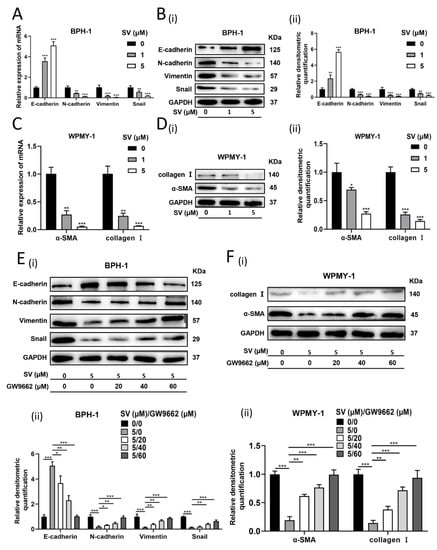 We further investigated the effect of SV on relevant indicators of EMT and fibrosis in prostate cells. As shown in Figure 4A,B, in SV-treated BPH-1 cells, it was observed that E-cadherin expression was amplified, whereas N-cadherin, Vimentin, and Snail were significantly lowered at both mRNA and protein levels. In addition, SV significantly suppressed the mRNA and protein expression of fibrosis markers α-smooth muscle actin (α-SMA) and collagen I in WPMY-1 cells (Figure 4C,D). Again, PPARγ antagonist GW9662 significantly rescued the aforementioned changes produced by SV (Figure 4E,F).