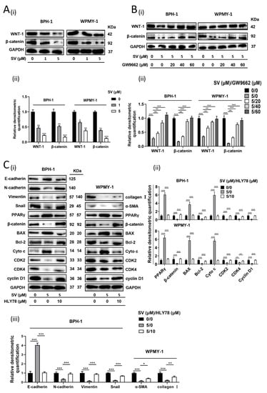 The WNT/β-catenin pathway is closely related to PPARγ as a fundamental signaling pathway with a wide range of effects. SV dose-dependently attenuated the protein levels of WNT-1 and β-catenin in BPH-1 and WPMY-1 cells (Figure 5A). On the other hand, this inhibitory state generated by 5 μM SV could be abolished by PPARγ antagonist GW9662 in a concentration-dependent manner (Figure 5B). Moreover, 10 μM WNT/β-catenin pathway activator HLY78 could restore the SV-induced alterations of proteins (E-cadherin, BAX, and Cyto c were upregulated; N-cadherin, Vimentin, Snail, α-SMA, collagen I, Bcl-2, CDK2/4, Cyclin D1 were downregulated) (Figure 5C). Interestingly, PPARγ upregulated by SV was similarly rescued with pretreatment of HLY78, maintaining a negative correlation with β-catenin (Figure 5C).