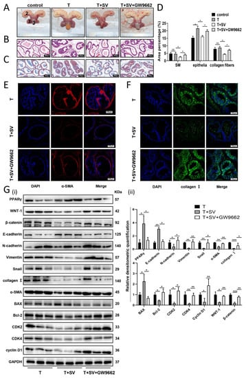SV inhibited BPH progression and WNT/β-catenin pathway through PPARγ in vivo. (A) The rat urogenital tissues from control, BPH, simvastatin-treated, and simvastatin + GW9662-treated rats. (1) Ventral prostate, (2) seminal vesicle, and (3) bladder. (B) Representative H&E staining of control, BPH, simvastatin-treated, and simvastatin + GW9662-treated rat prostates. (C) Masson’s trichrome staining of control, BPH, simvastatin-treated, and simvastatin + GW9662-treated rat prostates; prostate epithelial cells were stained orange, SM cells were stained red, and collagen fibers were stained blue. (D) Percentage of area (%) of different components in Masson’s trichrome staining. (E,F) Representative immunofluorescence staining of α-SMA and collagen I in prostate tissue from BPH, simvastatin-treated, and simvastatin + GW9662-treated rats. DAPI (blue) showing nuclear staining, Cy3 immunofluorescence (red) showing α-SMA protein staining, and Cy3 immunofluorescence (green) showing collagen I protein staining, and merged images are shown. (G) Western blot assay (i) and relative densitometric quantification (ii) of PPARγ, WNT-1, β-catenin, apoptosis-related proteins, cell-cycle-related proteins, EMT-related proteins, and fibrosis markers in BPH, simvastatin-treated, and simvastatin + GW9662-treated rats. n = 3 for each group. T = Testosterone propionate, SV = simvastatin, * p < 0.05, ** p < 0.01, *** p < 0.001; one-way ANOVA. The scale bars are 200 μm (panels (B,C)) and 100 μm (panels (E,F)).