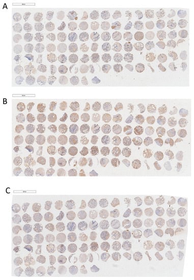 Immunohistochemical analysis of PPARγ, WNT-1, and β-catenin on TMA of BPH. (A) PPARγ, (B) WNT-1, (C) β-catenin. The scale bars are 4 mm.