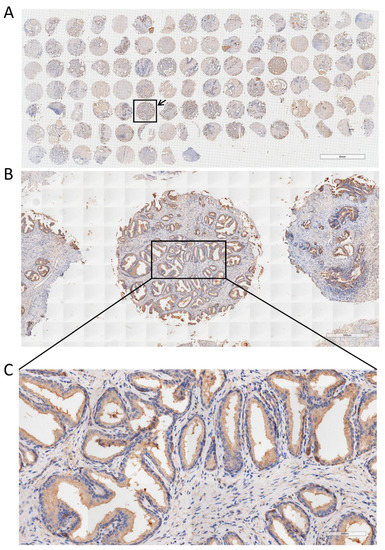 Immunohistochemical analysis of PPARγ on TMA of BPH. (A) Immunohistochemical staining of PPARγ in TMA containing 104 BPH samples, the arrow shows a randomly selected tissue sample. The scale bars are 4 mm. (B) The enlarged image of the tissue sample selected in A. The scale bars are 500 μm, and enlarge the image in the frame to obtain (C) with a scale of 100 μm.